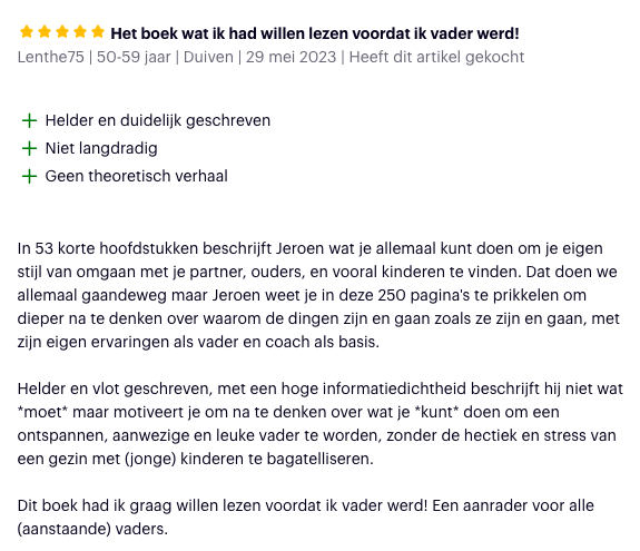 Geen opvoedboek maar een boek over vader worden en zijn. Supergoed cadeau om vaders te geven. De korte hoofdstukken geven inspiratie en eye openers als vader. Ik merk dat het vanuit inspiratie en bezieling voor het vaderschap is geschreven en dat vind ik heel mooi. En het is praktisch en no-nonsense. – Sam